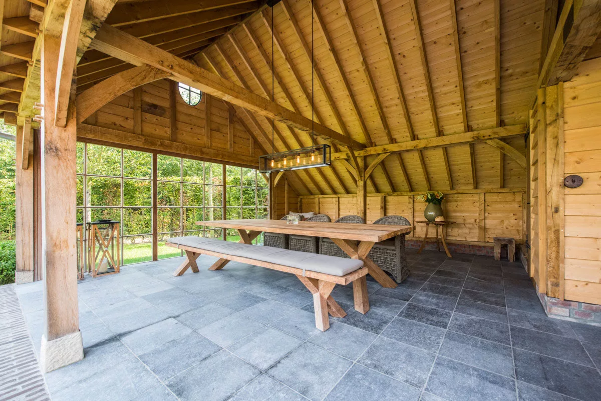 Naast de zwemvijver vormt de houten poolhouse een knusse en sfeervolle plek om te relaxen, met een stijl die harmonieus aansluit bij het landelijke karakter van de tuin. Het ontwerp van de tuin speelt in op de wensen van de klant, waarbij een balans wordt gevonden tussen functionaliteit en esthetiek.