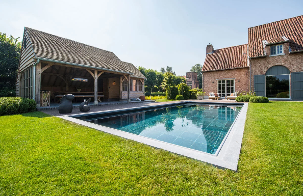 Deze hybride zwemvijver is het stralende middelpunt van een tuin die perfect balanceert tussen rustieke charme en moderne luxe. Het zwemvijverontwerp wordt omlijst door zorgvuldig aangelegde groene hagen en een weelderig gazon, wat zorgt voor een natuurlijke en serene uitstraling. De volledige tuinaanleg en de symmetrische indeling versterken de verfijnde eenvoud van deze buitenruimte.